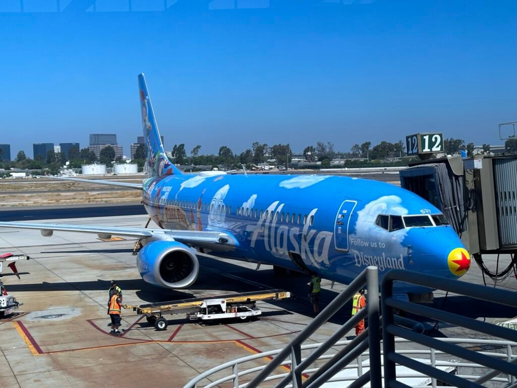 Departing John Wayne Airport (a much calmer option than LAX), the family flew to Seattle aboard a Disney-themed plane, greeted by Rex before takeoff.